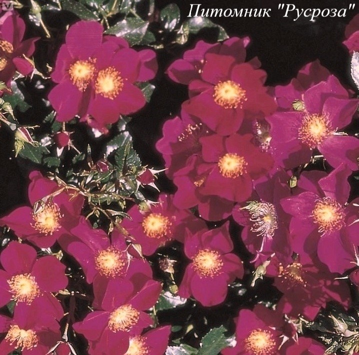 Цветок: ярко красный бархатистый с малиновым оттенком, белым центром и оранжевыми тычинками, плоский, простой, 5 - 8 лепестков в одном цветке, диаметр цветка 4 - 5 см, обладает легким ароматом с нотками мускуса.