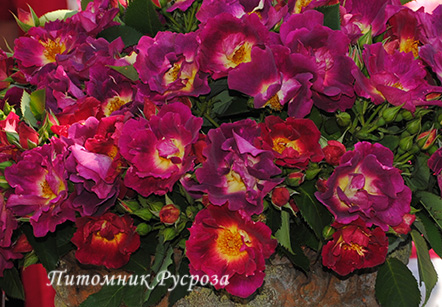Цветок: сиренево-фиолетовый с красноватым оттенком, чашевидный с волнистым краем лепестка, густомахровый, 80 - 100 лепестков в одном цветке, диаметр цветка 7 - 10 см, обладает насыщенным цитрусовым ароматом, устойчив к дождю.