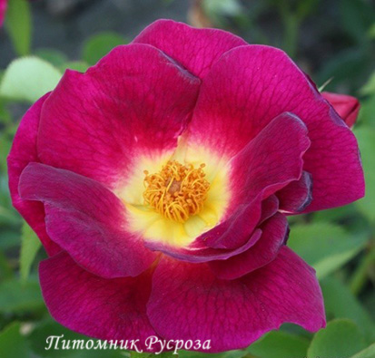 Цветок: темно-фиолетовый с ярко-жёлтым центром, плоскочашевидный, простой, 4 - 8 лепестков в одном цветке, диаметр цветка 7 - 8 см, обладает лёгким ароматом.