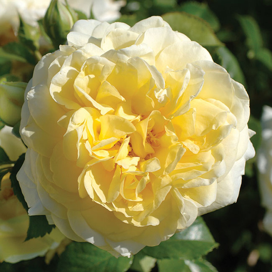 Цветок: светло-желтый с белой каймой, чашевидный до розетковидного, густомахровый, 95 - 98 лепестков в одном цветке, диаметр цветка 10 - 12 см, обладает приятным ароматом.