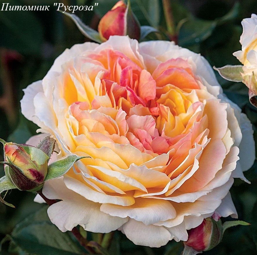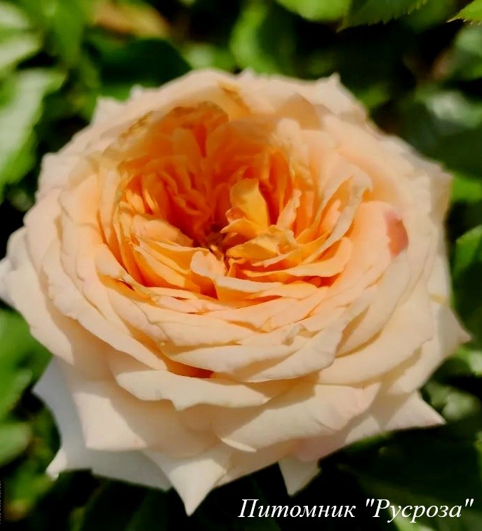 Цветок: нежно оранжево-розовый с желто-абрикосовым оттенком и сливочно-кремовыми внешними лепестками, по мере распускания светлеет до белого, розетковидный, густомахровый, 70 - 100 лепестков в одном цветке, диаметр цветка 10 - 13 см, обладает легким ароматом, долго сохраняет форму, пригоден для срезки.