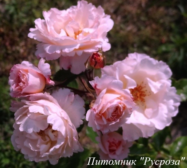 Цветок: нежно кремово-розовый с абрикосовым центром и белыми внешними лепестками, шаровидный до розетковидного с волнистым краем лепестка, махровый, 25 - 40 лепестков в одном цветке, диаметр цветка 6 - 8 см, обладает ароматом, долго сохраняет форму, пригоден для срезки.