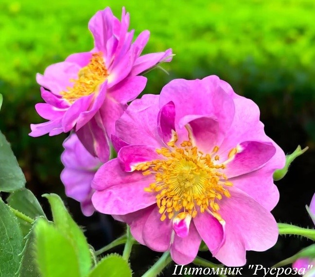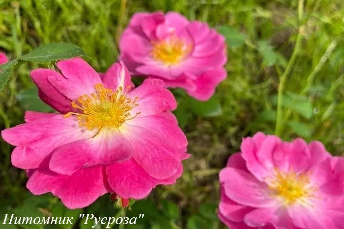 Цветок: темно-розовый до нежно розового с белыми штрихами у основания лепестка и желтыми тычинками, плоскочашевидный, полумахровый, 10 - 16 лепестков в одном цветке, диаметр цветка 7 - 10 см, обладает насыщенным ароматом с пряными нотками, привлекательный для пчел и шмелей, устойчив к неблагоприятным погодным условиям (солнце, дождь, ветер).