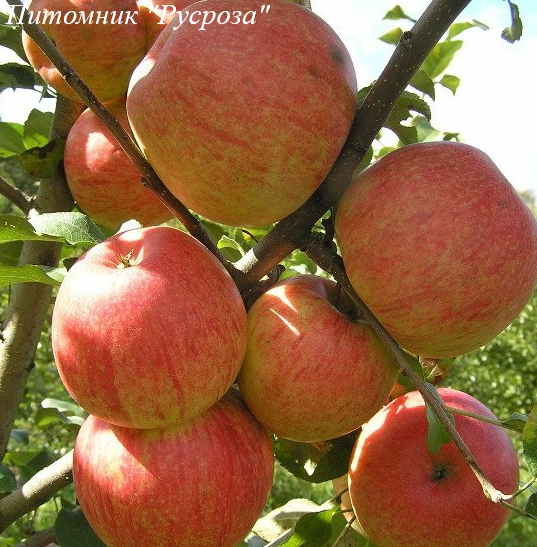 Плоды: средние, одномерные, плоскоокруглой формы, поверхность гладкая или слабо широкоребристая. Кожица гладкая, с сильным восковым налетом. Основная окраска зеленовато-желтая. На половине или большей части поверхности плода размытый румянец, неяркий. Мякоть зеленовато-белая, нежная, сочная, мелкозернистая.