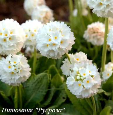 Цветение: в апреле - мае, цветки мелкие, около 1,5 см в диаметре, белоснежные, собраны в плотные шаровидные соцветия. Цветоносы крепкие, толстые, высота 20 - 40 см, с мучнистым налётом.