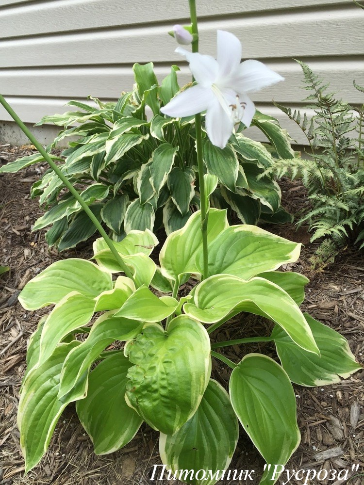 Растение: декоративное весь сезон до заморозков высотой около 60 см. Быстро разрастается на богатых гумусом почвах, образуя компактные куртины. Листья прикорневые сердцевидные зеленые с кремово-белой каймой.