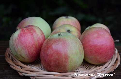 Плоды: средние (массой 85-145 г), одномерные, правильной формы. Кожица нежная, гладкая, со слабым восковым налетом. Окраска в состоянии съемной зрелости зеленоватая, с размытым полосатым розовым румянцем на меньшей части плода, в состоянии потребительской зрелости – зеленовато-желтая, покровная – полосатый пурпурный румянец на большей части плода. Подкожные точки малочисленные, светло-зеленые, слабозаметные. Мякоть зеленовато-белая, средней плотности, нежная, мелкозернистая, сочная, почти пресного вкуса, с сильным ароматом.