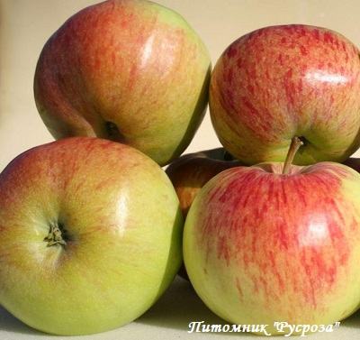 Плоды: массой 150-180 г. Округлой формы. Цвет плодов зеленоватый, но большая часть покрыта полосатым румянцем. Мякоть плодов сочная, в начале созревания имеет плотную структуру.