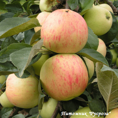 Плоды: среднего размера (100 - 130 г), одномерные, плоскоокруглой формы, поверхность гладкая или слабо широкоребристая. Кожица гладкая, с сильным восковым налетом. Основная окраска светло-зеленая. На половине или большей части поверхности плода крапчато-полосатый румянец по розовому фону, неяркий. Мякоть зеленовато-белая, нежная, сочная, мелкозернистая.