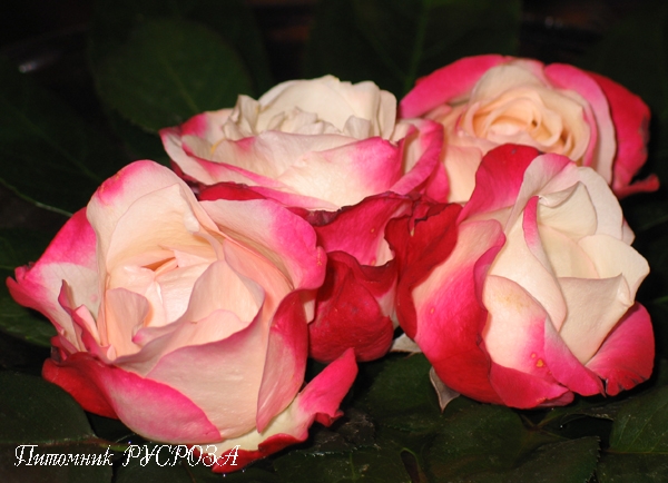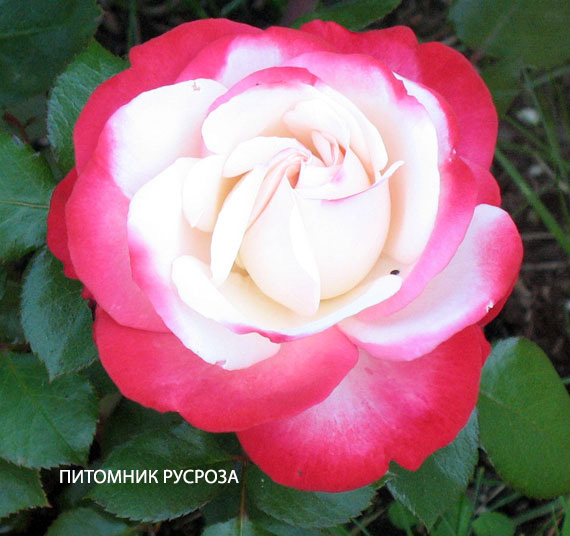 Цветок: нежно-кремово-белый с ярко вишнево-красным слегка волнистым краем лепестка, махровый, 35 - 45 лепестков в одном цветке, диаметр цветка 9 - 11 см, обладает насыщенным сладким ароматом, очень устойчивый к неблагоприятным погодным условиям (солнце, дождь), долго сохраняет форму и цвет.
