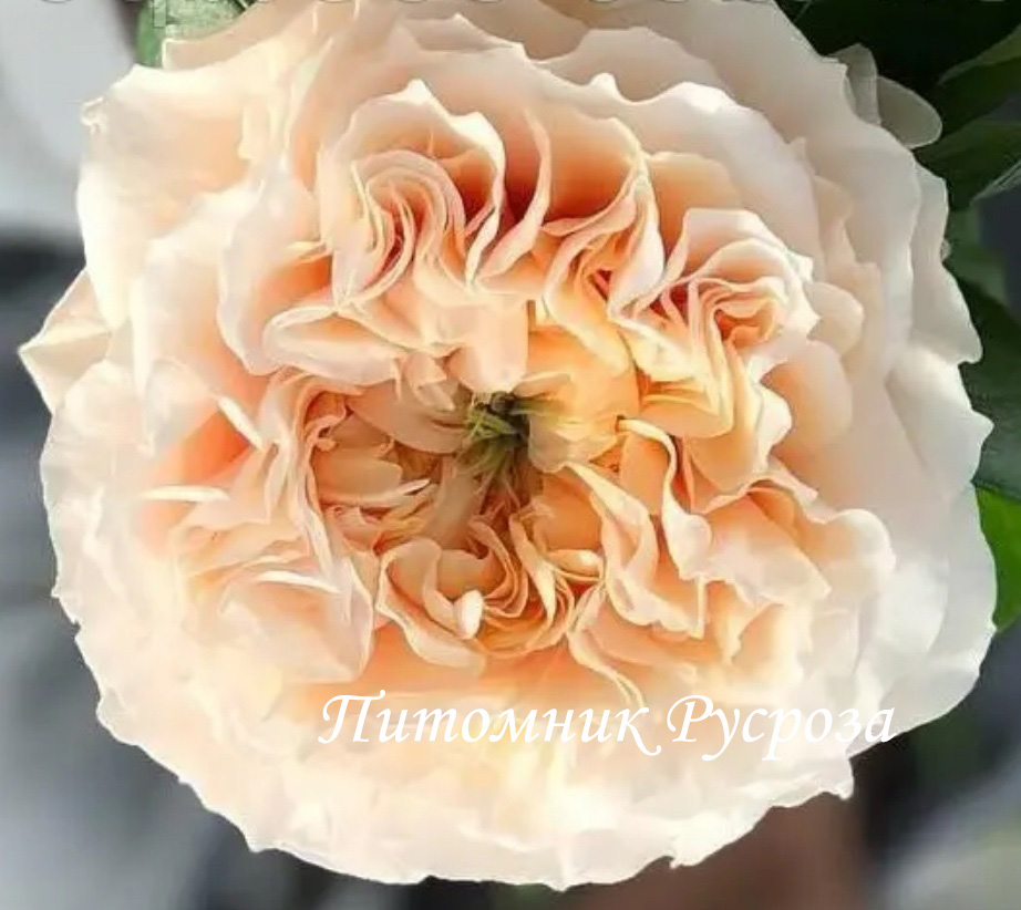 Цветок: нежно абрикосовый с кремовыми внешними лепестками, иногда с зеленым глазком, розетковидный с волнистым краем лепестка, густомахровый, 60 - 100 лепестков в одном цветке, диаметр цветка 8 - 10 см, обладает очень насыщенным фруктовым ароматом, долго сохраняет форму, пригоден для срезки, устойчив к дождю.