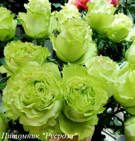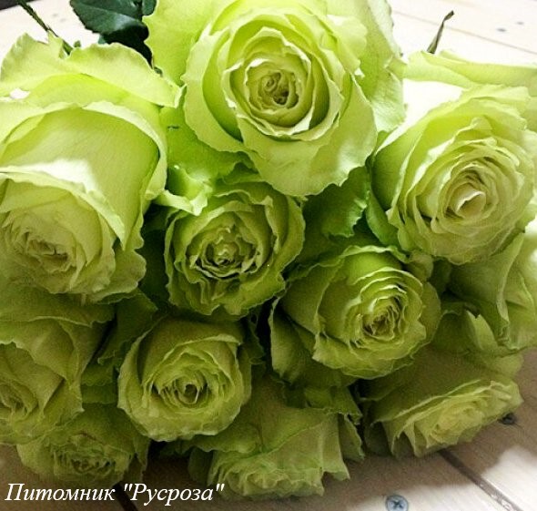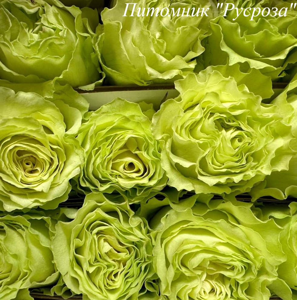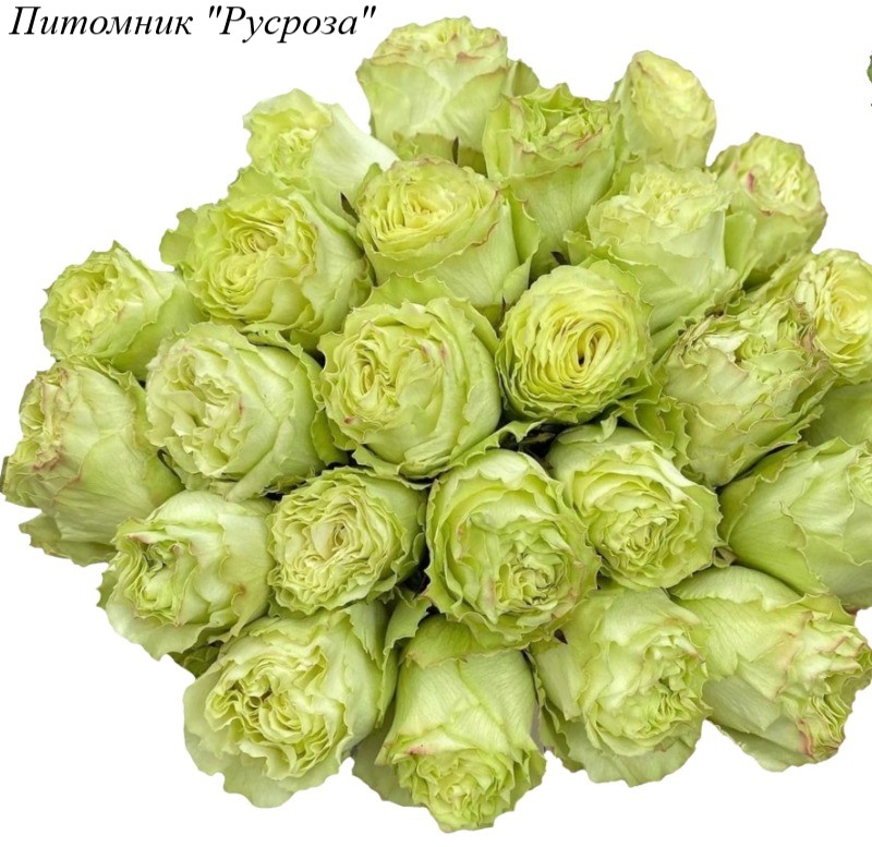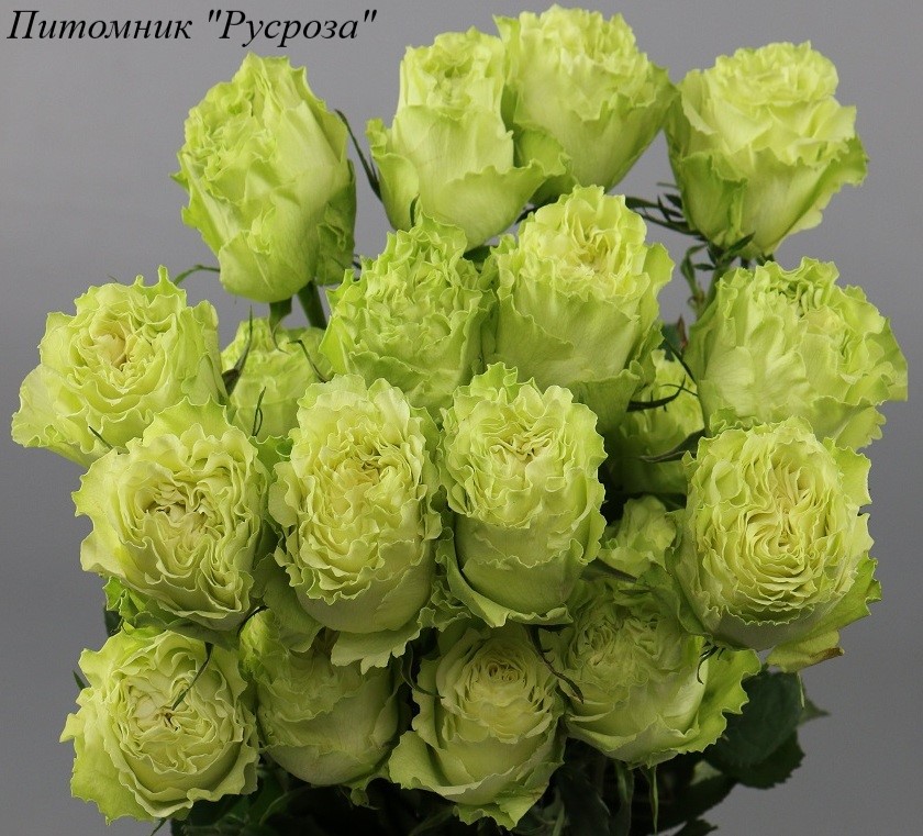 Цветок: зеленый с салатово-лимонным оттенком и бело-кремовым центром, чашевидный с высоким центром и волнистым краем лепестка, густомахровый, 40 - 60 лепестков в одном цветке, диаметр цветка 10 - 12 см, обладает легким ароматом с нотками зеленого яблока, долго сохраняет форму, пригоден для срезки.