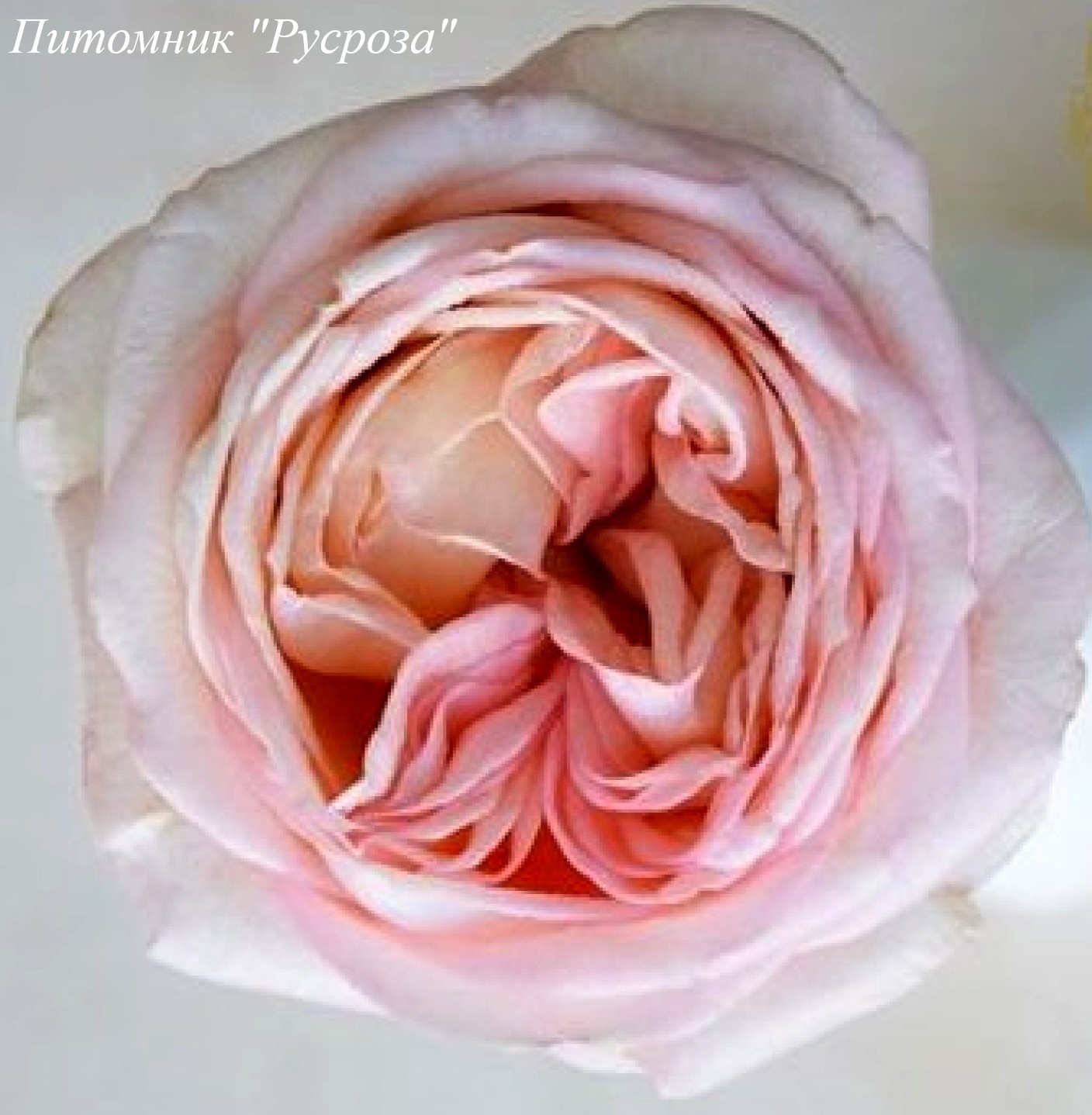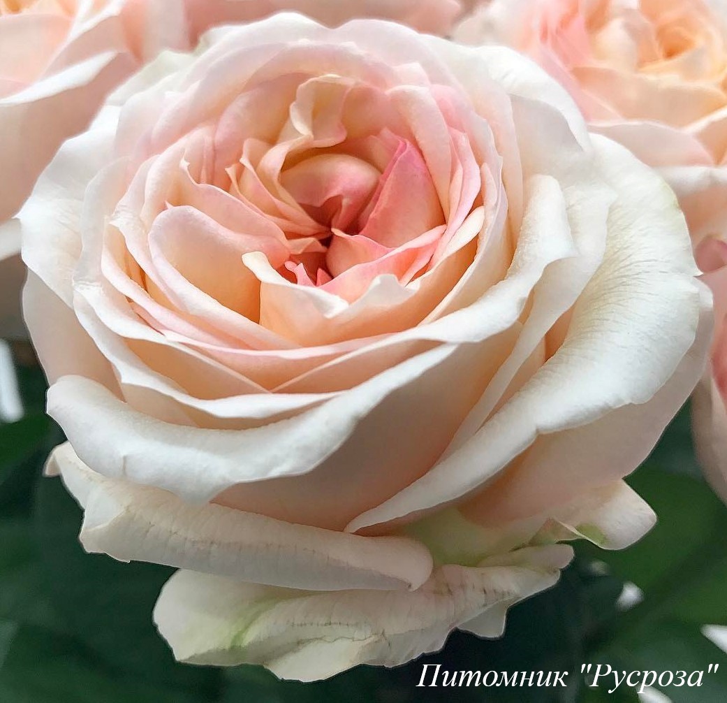 Цветок: белый с розовым центром и кремовыми внешними лепестками, шаровидный до розетковидного с закручивающимся внутрь краем лепестка, густомахровый, 80 - 100 лепестков в одном цветке, диаметр цветка 10 - 12 см, обладает очень насыщенным ароматом с нотками лимона и аниса, долго сохраняет форму, пригоден для срезки.