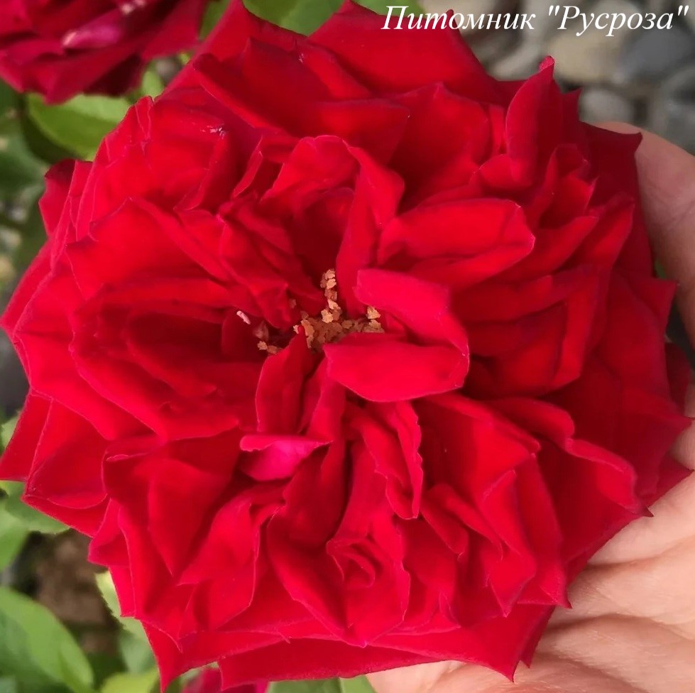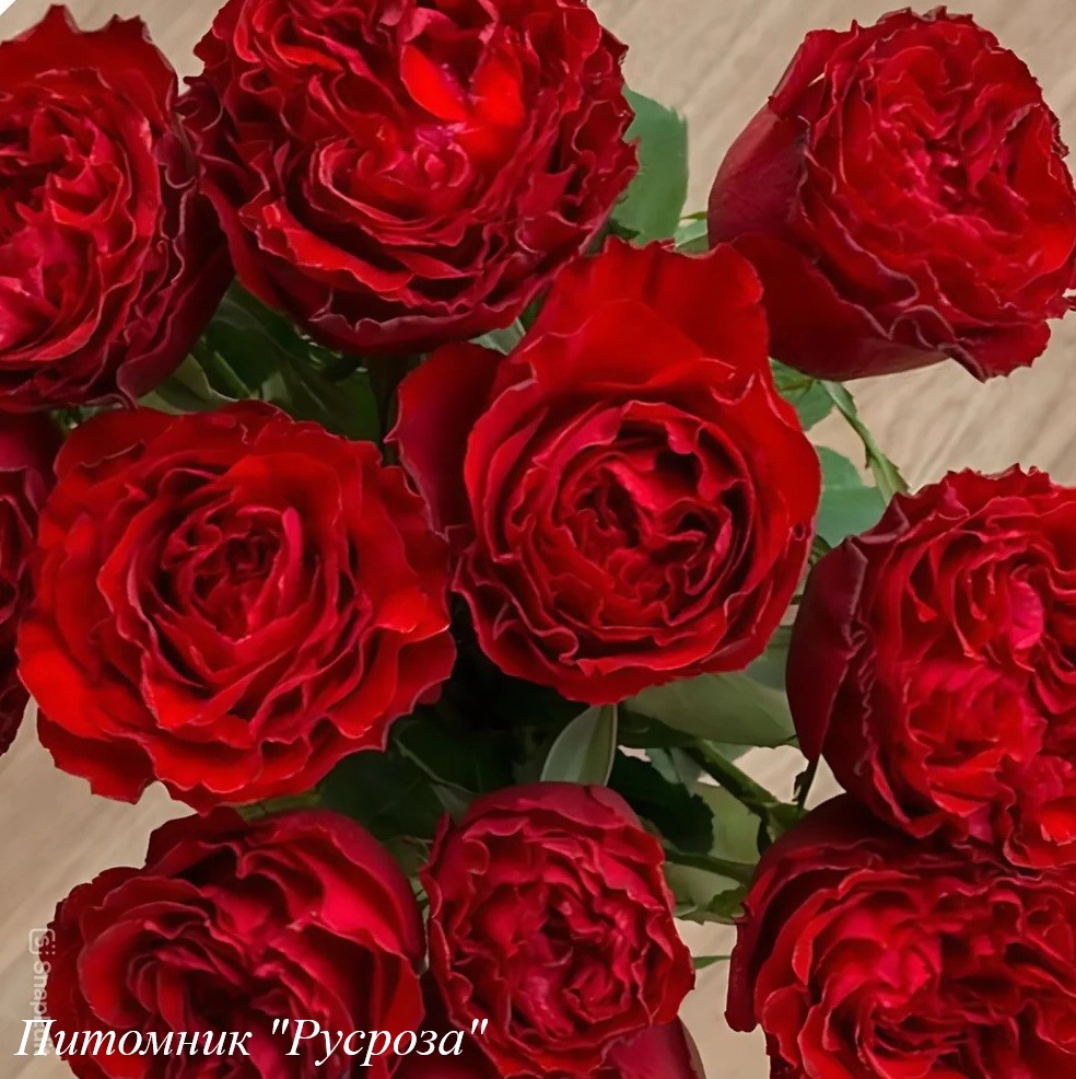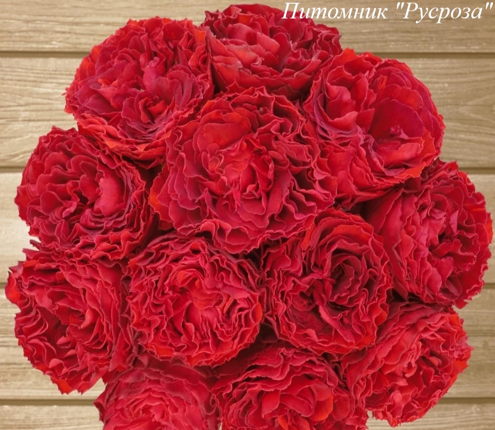 Цветок: ярко красный, при полном распускании с зеленым глазком, чашевидный до розетковидного с волнистым краем лепестка, густомахровый, 100 - 130 лепестков в одном цветке, диаметр цветка 8 - 10 см, обладает ароматом, очень долго сохраняет форму, пригоден для срезки.