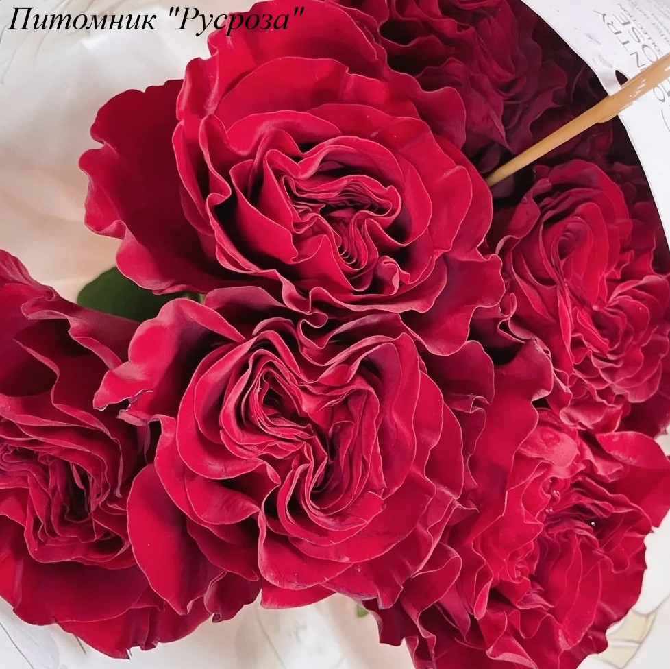 Цветок: красный с волнистым краем лепестка, чашевидный, с высоким центром, густомахровый, 40 - 50 лепестков в одном цветке, диаметр цветка 9 - 12 см, обладает легким ароматом, долго сохраняет форму, пригоден для срезки.