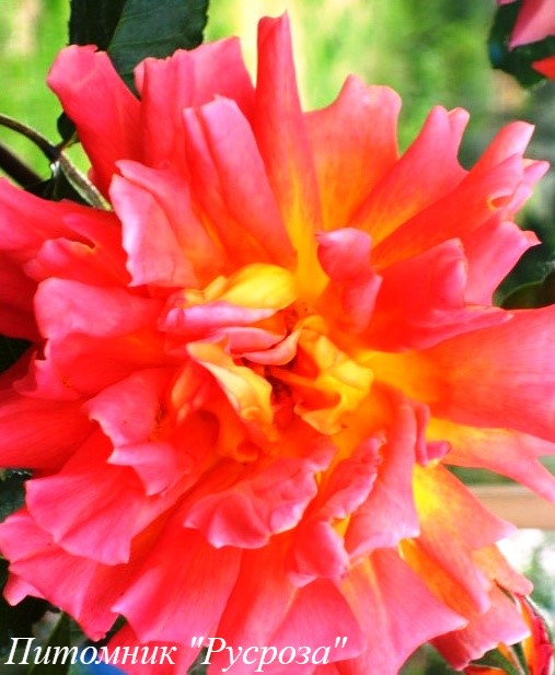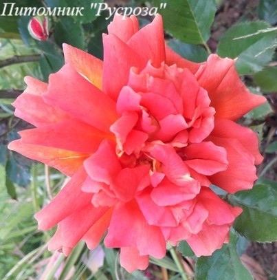 Цветок: оранжево-желтый с розово-коралловым оттенком, при полном распускании становится оранжевым, чашевидный, с высоким центром, махровый, 25 - 40 лепестков в одном цветке, диаметр цветка 8 - 10 см, обладает насыщенным ароматом.