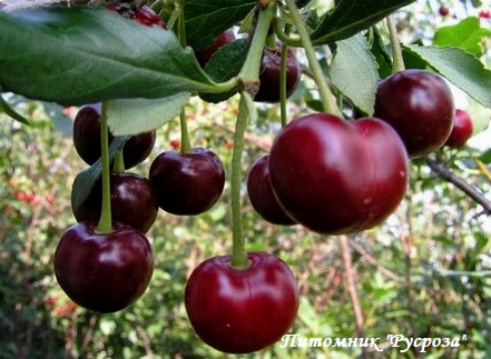 Плоды: средние (2,5 - 3,4 г), неоднородные, плоскоокруглой формы. Основная окраска плода черно-красная. Кожица покрыта многочисленными серыми точками. Мякоть темно-красная, плотная, волокнистая, сочная. Сок густой, темно-вишневый. Косточка свободная, отделяется от мякоти хорошо, средней величины, овальной формы. При полном созревании плоды отделяются с сухим отрывом.