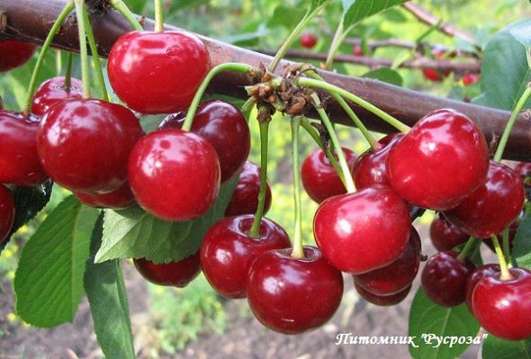 Плоды: крупные (6,8 - 7,5 г), округлой формы. Покровная окраска темно-красная. Мякоть темно-красная, умеренно плотная, сочная. Косточка крупная, легко отделяется от мякоти. Транспортабельность хорошая.