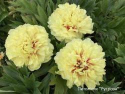 Цветок: нежно-желтый с красными вкраплениями в центре, плотный, махровый, крупный, диаметр цветка 16 - 18 см, обладает легким ароматом, отлично подходит для срезки.