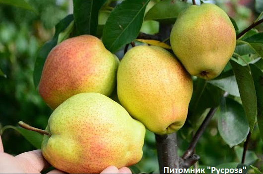 Плоды: крупные (150 - 230 г), одномерные, короткогрушевидные. Основная окраска зеленовато-желтая, покровная – слабый румянец по меньшей части плода. Кожица гладкая, с многочисленными подкожными точками. Товарность плодов высокая.