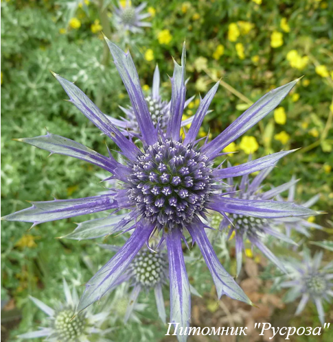 Цветение: с июля по август. Соцветия плотные, головчатые, зеленовато-синие. Листочки обертки колючие, глубоко рассеченные, на концах заостренные, сине-серебристые.